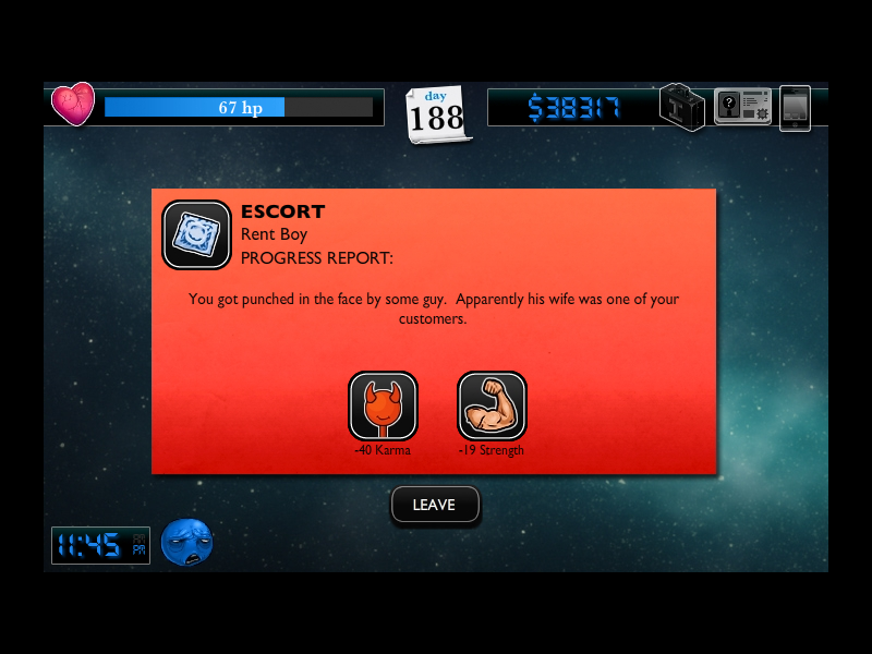 "You got punched in the face by some guy. Apparently his wife was one of your customers." (-40 Karma, -19 Strength)