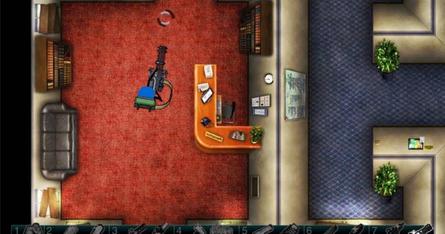 The Gangster HQ from the inside looks like a typical office. The lobby of the Gangster HQ is a typical reception area floored with a textured red carpet. A large, spacious recreation area is stationed ahead of the lobby. Two tables and a ping-pong table is stationed at the centre of the room. The rightmost area of the HQ is a maze of small workstations, complete with computers and some papers. There is a restroom located at the top-west corner of the Gangster HQ.