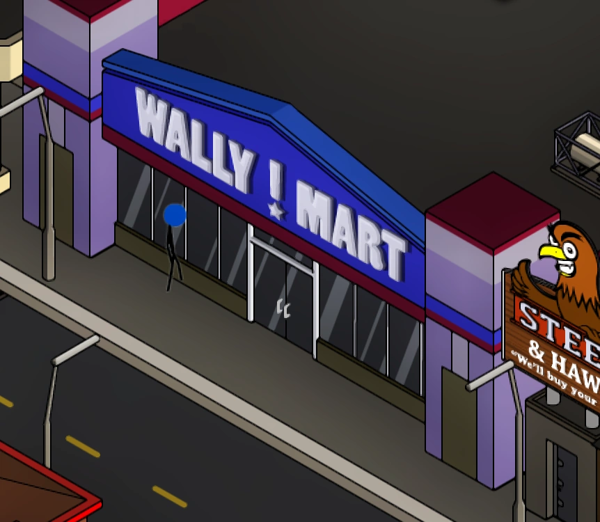 Wally-Mart (stylised as Wally ! Mart) is a large store building on the Third Island of Paper Thin City. It can be purchased in the bank for $3,800,000. Wally-Mart is also the home of The Grand Trump, who offers the Rock Star profession.